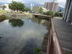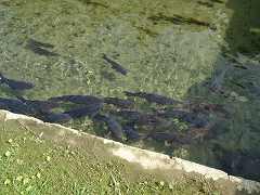 | 石槌山からの綺麗で冷たく豊富な水が自噴する。飲んでみたかったが、・・・ | 綺麗な水に、80cm近い大きな鯉が群れていた。 | 自噴泉「うちぬき」を辿って行くと堀にたどり着く。堀の中には創立120周年の県立西条高等学校があった。これがその校門。 |
