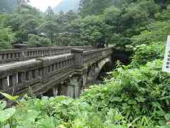 | 8:51 西之川バス停近くの大宮橋。土木遺産説明資料では、「開腹式の優美なデザインのアーチ橋である。リズミカルに配置された支柱間もアーチとし、ディテールも非常に美しい。」とある。 | 8:51 大宮橋を渡ったところの旧小学校。ここで本来なら幕営を予定していたが、・・・・・・ | 10:23 名古瀬の登山口。この看板を見落としてしまい左の林道をどんどん登ってしまった。途中でGPSで間違いに気付きここまで戻ってきた。 | 13:27 瓶壺に到着。ここに西之川への登山道進入禁止のロープがあった。下の入口にはなかった表示、できれば下にも表示して欲しかった。途中の谷は11号台風の大水で底が抉られ渡しのロープは宙吊り状態。あてに出来なかった。浮き石も多く滑ると命はなかった。道を示す赤テープも流されて間が飛んでいて確認に時間を要した。ここではGPSも使えず。 |
