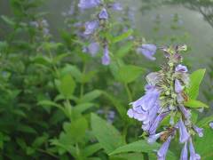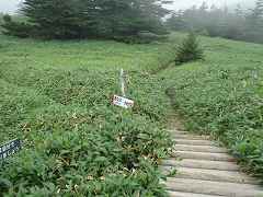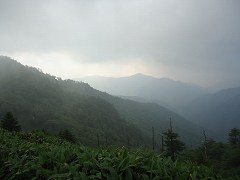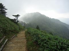 | 6:12 土小屋を出て1時間ほど。休憩地辺りから東の空を望む。ガスの中に薄っすらと山々が重なって連なっています。 | 6:12 これから向かう石鎚山方面を望む。 | 登山道沿いに咲く山の花、花、花。 | ガスに濡れひと際可愛い花。 |