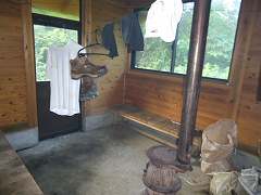 | 13:27 これから向かう瓶ケ森登山口方面。ガスに覆われている。 | 14:11 子持権現山辺りの巨岩。 | 15:00 シラサ避難小屋に到着。今晩はここが貸切状態。 | 中にあるダルマストーブを燃やし、濡れた衣類や登山靴を乾かしています。 |