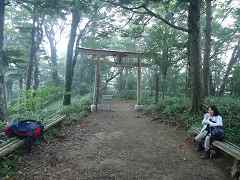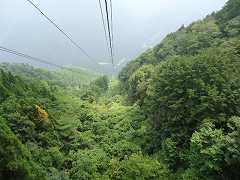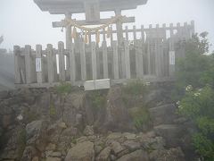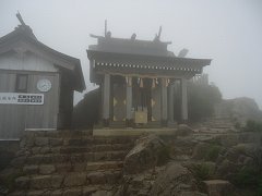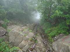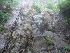 | 7:10 ニの鎖。大したことないだろうと臨んだが荷物を背負っては怖かった。ガスで鎖が濡れており、滑らないように気を使った。鎖の丸い輪っぱの中につま先を入れざるを得ないところも多くあり、登山靴のつま先が入りきらずに怖い思いをした。 | 7:37 頂上 石鎚神社 | 7:38 今は通行止めになっている一の鎖。社務所横の登り口から下を覗きこんだがまっすぐ下に伸びていた。 | 7:40 頂上石鎚神社。せっかく登ったが、ガスに包み込まれ視界50m。全く周りは見えなかった。 |