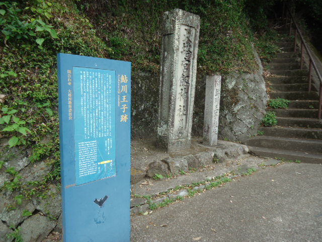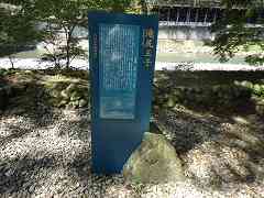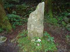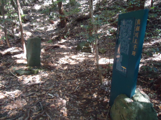 | 12:44 鮎川王子 藤原定家は、1201年10月13日、この王子社に参拝し、日記には「アイカ王子」と書いています。鮎川王子と記されているのは、1210年に熊野に参詣した藤原頼資の日記です.アイカも鮎川も、合川(川か合流するところ)に由来するようです。頼資は修明門院に随行して熊野参詣をしたのですが、鮎川付近で災難に遭遇しました。 4月28日、大風雨のの中、田辺を出発した一行は、石田河の一の瀬を渡ったころから、川か増水しはじめ、頼資は鮎川王子にたどり着きますが、六の瀬の付近で溺死者が出たのです。随行した公卿の従者等9名が命を落とし、女院も急遽予定を変更して真奈子(中辺路町真砂)に宿泊しています。江戸時代には王子社といわれ、拝殿を備 えていましたが、明治時代に住吉神社に合祀されました。跡地は、その後、崩壊して原形を留めず、石碑が建つのみです。 〜 説明板から〜 |