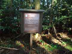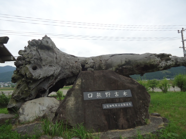 | 13:58 口熊野・樟(くす)の大古木 モニュメント 熊野のクマは、辺地をさすと言われ、熊野地方は原生林がうっそうと茂っていました。明治22年(1889)には、この地方に未曾有の大水害があり、富田川の水源地帯では山崩れが多く、川を堰き止めその堰が切れて大水(鉄砲水)が被害を大きくしました。この樟の大古木は、樹齢約五百年とも言われ、上流より流されてきて 平成九年に百余年ぶりに川底より姿を現し、平成11年の南紀熊野体験博・中辺路いやしの広場モニュメントとして好評を博しました。 〜 説明板から〜 |