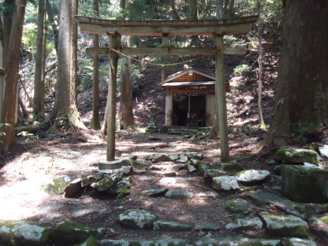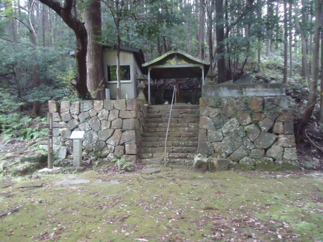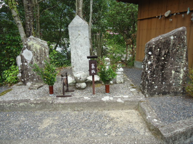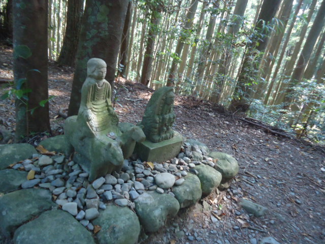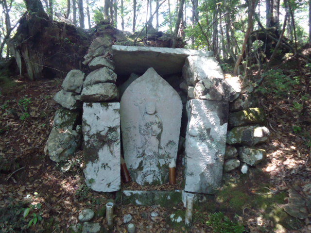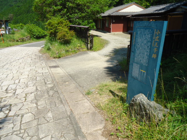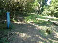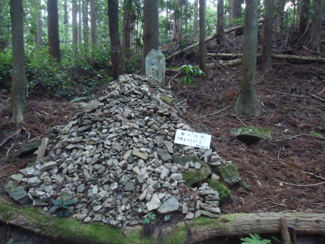 | 7:35 牛馬童子バス停で降りて、道の駅で一休み。 | 7:52 大坂本王子。 大坂(逢坂峠)の麓にあるところから、この王子社名が付いたようです。 | 7:52 大坂本王子に立つ笠塔婆。 鎌倉時代後期のもので滝尻王子や大門王子にも同様のものがある。元には笠石が乗っていたのかどうかは書かれていない。 | 8:43 上多和(うわたや)茶屋跡 この山は標高600m。熊野詣での盛んな頃は、ここに茶屋もあったといわれ、大正期にも人家があって林中には三界万霊塔やお墓もある。 |