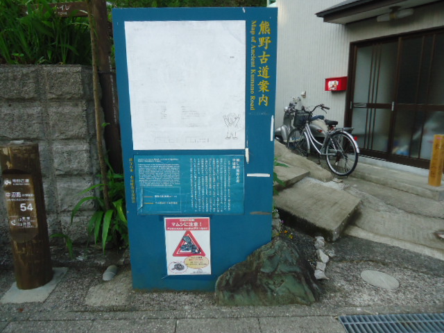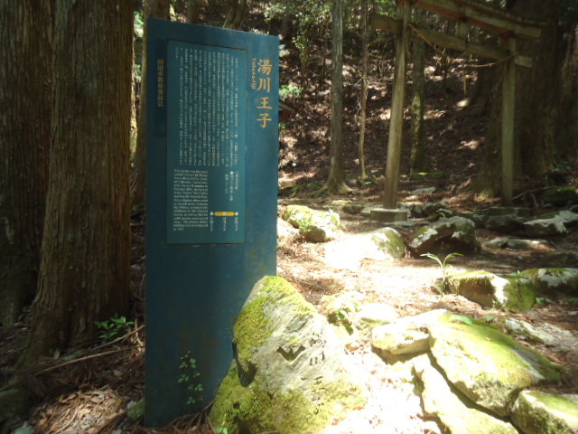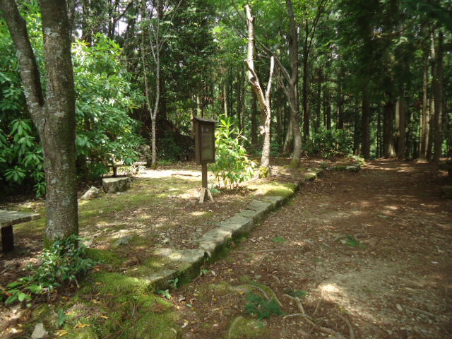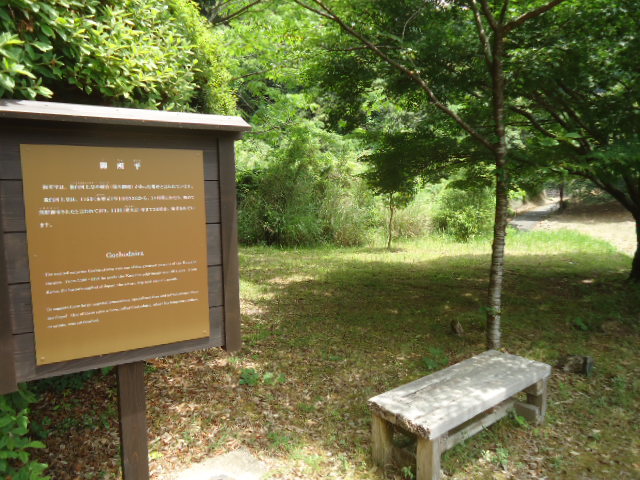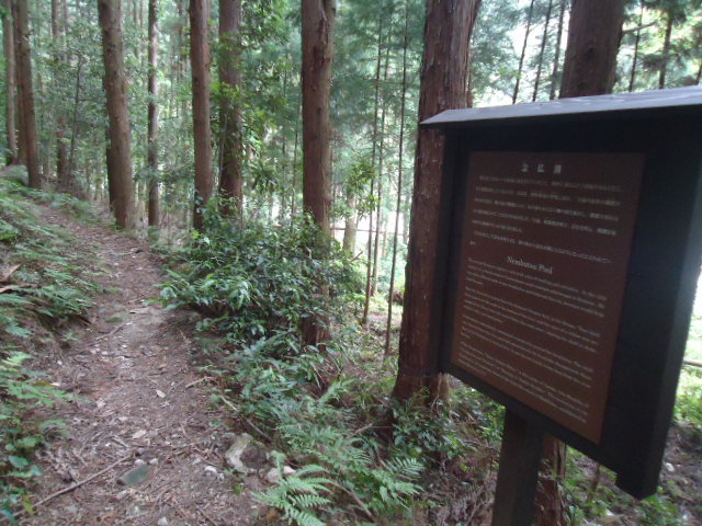 | 12:19 御所平 御所平は、後白河上皇の頓宮(仮の御殿)があった場所と言われています。後白河上皇は1160年10月23日から、1ヶ月にわたり、初めて熊野御幸されたと言われており、1191年まで30回余り、御幸されています。 〜 説明板から〜 |