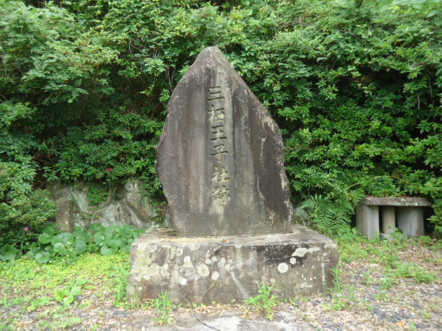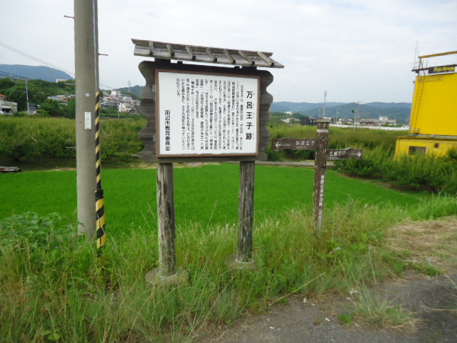 | 16:15 万呂王子 万呂王子は、藤原宗忠の「中右記」1109年の条にはその名がみえず藤原定家の「御鳥羽院熊野御幸記」1201年10月13日の条には「秋津王子を過ぎて、次に山を超え丸王子に参る」とあり、この間に祀られたと考えられているが、秋津王子からの古道は定かではない。万呂王子の旧地については、11792年の「田辺領神社書上帳」に 「御神体石」、「往古より熊野九十九王子之内と申伝御座候」、「社僧社人無御座、無宮之神主一人御座候」などの記述かある。 明治10年(1877年)八月に、下万呂の須佐神社(旧名牛頭天王社)に合祀される前は、この付近に小さな森かあり、王子の面影か残っていたといわれている。 〜 説明板から〜 |