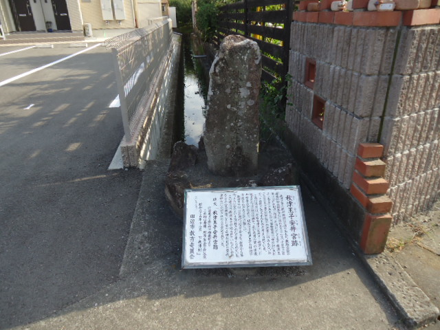 | 17:02 秋津王子 安井宮跡 秋津王子の創祀時期は不明であるが、藤原定家の『後鳥羽院熊野御幸記』建仁元年(1201年)10月13日条に「前夜田辺に宿泊、早朝出立してまず秋津王子に参る」とある。しかし、藤原宗忠の『中右記』天仁2年(1109年)10月の熊野詣での記事には見えないので、この間に祀られたものと考えられています。 この付近一帯は左右会津川(三栖川、秋津川)に挟まれた氾濫原の低地で、長い年月の間の水没や水害などにより、現在では秋津王子の旧地や古道をたどることは難しい。秋津王子は江戸時代になってからも、柳原から落合、さらに安井という地へ移されたと考えられている。 この碑には、秋津王子が祀られていたといわれる安井宮が明治3年に雲の森神社(現在の豊秋神宮)に合祀されていたことが記されている。 〜 説明板から〜 |