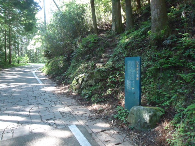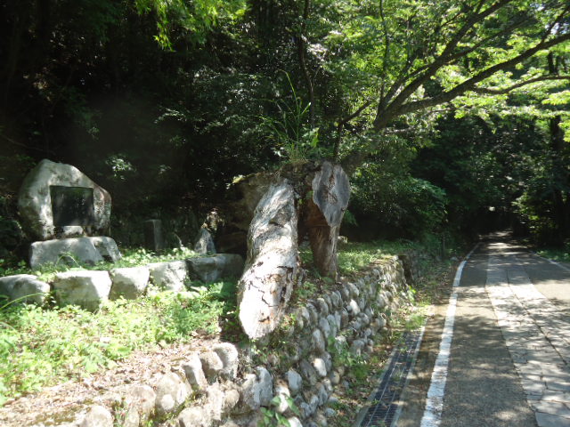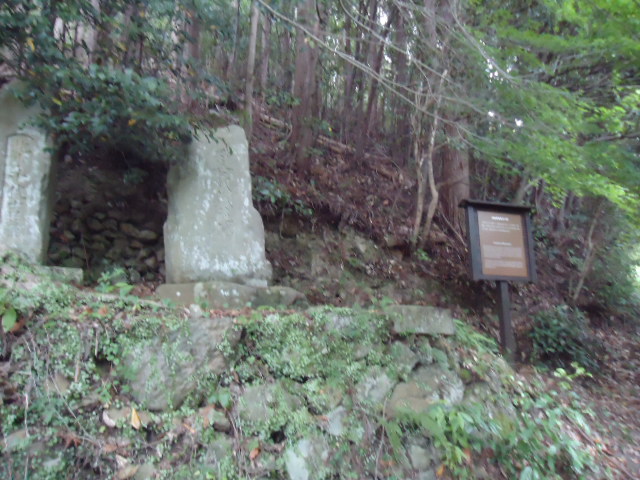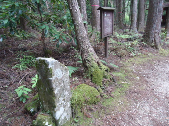 | 11:13 石堂茶屋跡 1739年の「熊野めぐり」には「石堂峠」として、茶屋が2軒あり旅客を泊めていた、と記されている。また、1789年の「熊野詣紀行」では「さハのたわ茶屋」と呼んでいる。1848年の「西国三十三名所図会」には「石砥茶屋」とあり、山中から砥石がとれたため名づけられたとの記述がある。茶屋跡の中央付近には、枝が連なった桜 (連理桜)の顕彰碑も建つ。敷地の北側には水場、西方には茶店の墓石も残っており、往時の生活を偲ぶことができる。 〜説明板より 〜 |
