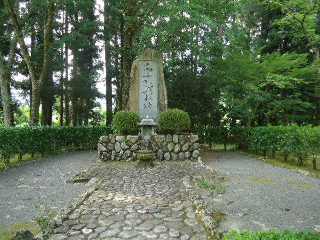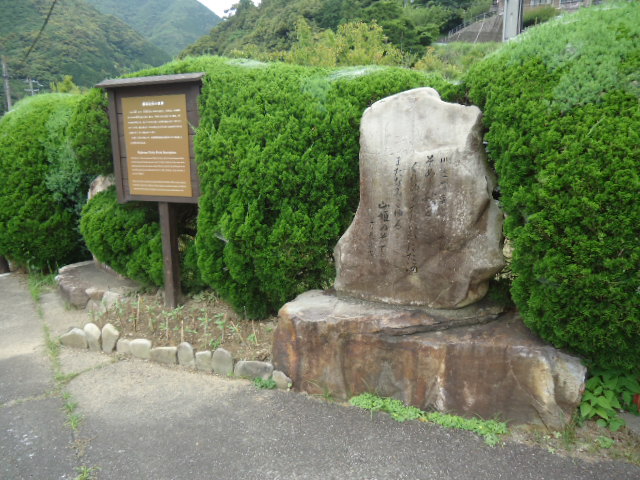 | 12:14 藤原定家の歌碑。 1201年後鳥羽上皇お供した定家は、10月13日、田辺御所からその日の宿所 滝尻に向かいました。「鮎川王子から滝尻王子の間は、川に写る紅葉がきれいだ。次にゴツゴツして険しい山を登り滝尻王子に着く」と書いています。その夜、滝尻の歌会で「そめし秋をくれぬとたれかいはた河またなみこゆる山姫のそで」 という歌を詠んでいます。 〜 説明板から〜 |