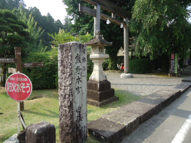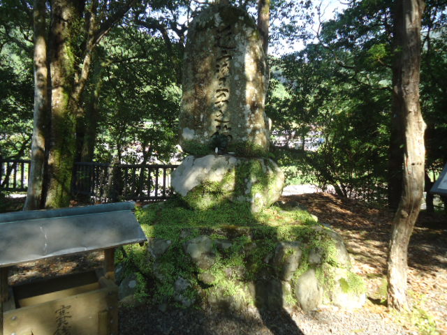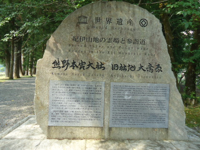 | 8:12 熊野本宮大社の旧社地「大斎原(おおゆのはら)」の石碑 明治22年夏、熊野川未曾有の大洪水にて、上中下各四社の内、上四社を除く中下社の八社殿二棟が非常なる災害を蒙り、明治二十四年、現在地(ここより西方700メートルの高台)に遷座しました。 |