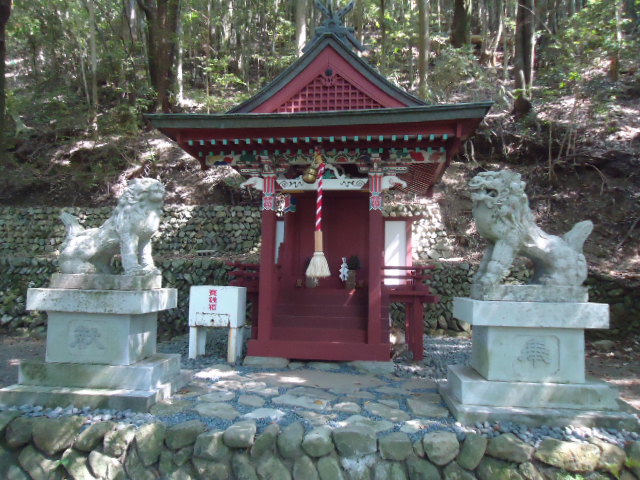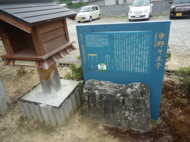 | 8:20 市野々王子 平安時代末の貴族、藤原宗忠(むねただ)の日記『中右記(ちゅうゆうき)』には、天仁二年(1109)条に熊野参詣の様子が記されていて、その十月二十七日条には「小川を数度渡り、一野王子社に参り、奉幣する」とあります。 近世には那智山の末社となり、若女一王子社あるいは市野々王子と呼ばれました。明治六年に那智山の支配から離れて、村社となり王子神社と改称。近隣にあった金刀比羅神社を合祀し、現在に至るということです。 市野々は八咫烏の子孫が住むといわれています。市野々王子の近くにある市野々小学校の校章もまた八咫烏です。 市野々王子はもとからここにあったという説と、100mほどの上手の文明の岡と呼ばれる所に旧社地があり、江戸時代にここに移されたのだという説があります。 |