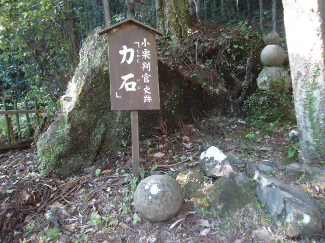| 15:10 湯の峰温泉 力石 小栗判官が湯治の間、体力の回復を試すため持ち上げた大小の石を人々は「力石」と呼んでいる。 |