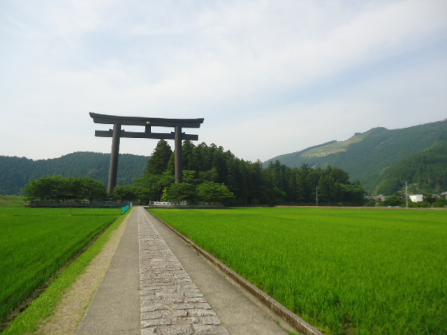 | 8:26 熊野本宮大社の旧社地「大斎原(おおゆのはら)」 田圃の間を真っ直ぐに参道が大鳥居に向かって伸びている。 |