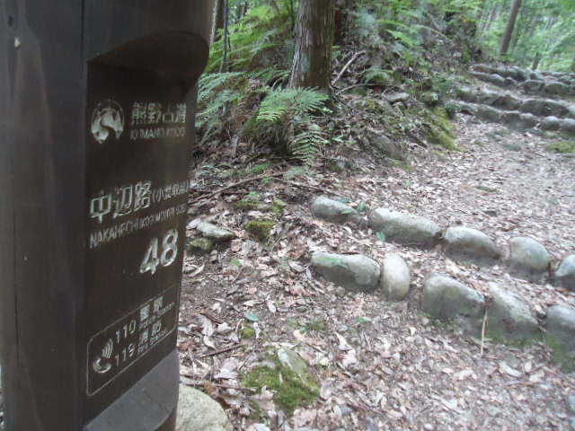 中辺路は紀伊田辺から熊野本宮大社に至る道、熊野本宮大社から熊野那智大社内と熊野三山とを結ぶ参詣道で、110kmにもおよびます。苔むした山道が続き、登り下りで疲れましたが、足掛け3カ年を要して歩き通しました。
