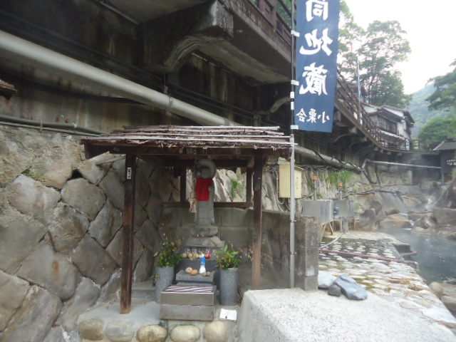 | 湯の峰温泉 湯筒地蔵 湯の峰温泉は成務天皇の御代(西暦23年)に発見された日本最古の温泉です。熊野詣の湯垢場(ゆごりば)として広く世に知られ奈良・平安の昔より、奥熊野の「薬湯」として名高い温泉です。「湯筒」は90度の白噴泉が私達に恵みを与えてくれています。また湯の峰温泉は「子宝の湯」とも言われ、多くの方がこの湯に入って 子宝を授かっています。 〜説明板より 〜 |