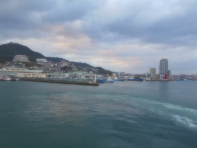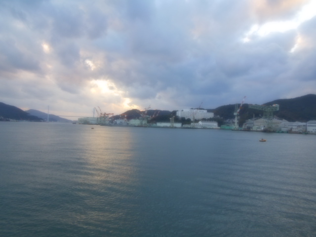 | 長崎港から福江港に向かってジェットフォイルに乗るつもりだったが、ピーチの遅れで間に合わなかった。乗ったのは、フェリーで3時間20分も掛かった。長崎港を出て、三菱重工長崎造船所のドックが見える。