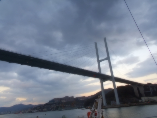 | 長崎港の港口に架かる長崎女神大橋の下を福江に向かってフェリーは進む。福江港についたのは夜の20時。真っ暗な中を宿に向かって歩いた。無事、宿につけたのはgoogle maps のお陰。