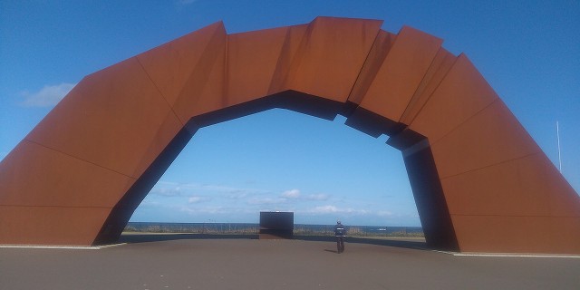 | 霧多布岬から納沙布岬への道路脇に立つ「母と子の像」 1960年5月23日4時15分(日本時間)にチリ中部海岸でマグニチュード83/4と記録された地震は現在まで人類に記憶された最大級のものである。この地震の初動は約20分で日本に到達し,地震に伴うて起った津波は16,600kmの距離を地球の裏側から表側へと約22時間で渡った。その津波で犠牲になった人々を偲んで立てられた。 |