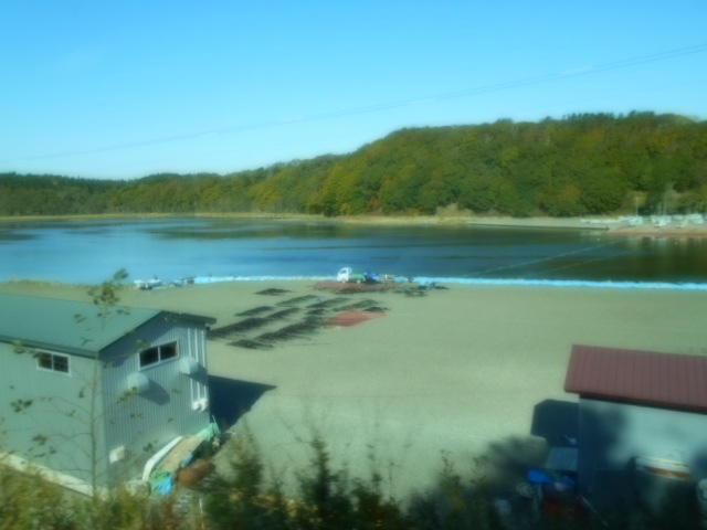 | 竿前昆布(間引き昆布)を砂浜で干す。間引いた後に残した昆布は長昆布(長さ14から15m)に育てる。 |