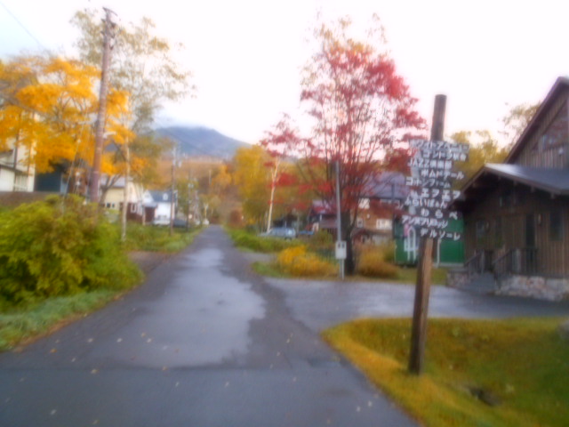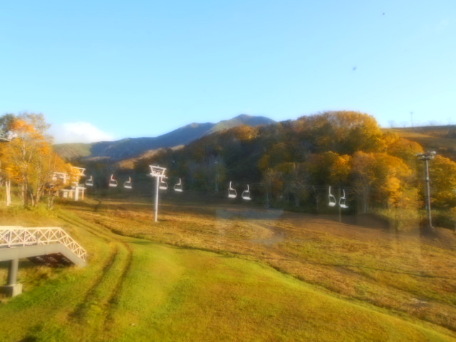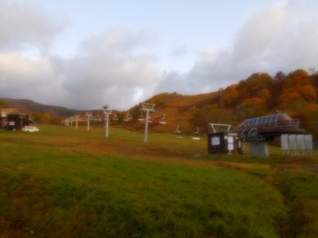 | ホテル横の「ニセコ アンヌプリ国際スキー場」 今は休んでますが、1週間前の14日まで営業していたようです。リフト終点の山の上では、紅葉が終わり落葉してしまったということでしょうか?。12月早々にはスキー用として営業が再開されます。 |