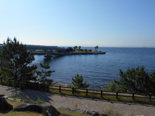| 淡路夢舞台の前の海岸。橋でつながるのは翼島。8:45でしたが、ゲート前に数台の車が並んでいました。 |