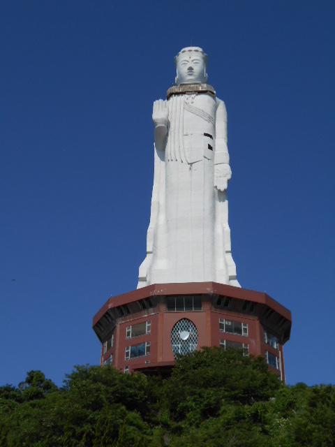 | 平和観音寺 高さ100mの巨大な観音像。左脇の黒いのはコンクリートパネルがハゲ落ちて穴が開いている。2022までに解体されるとか。 |