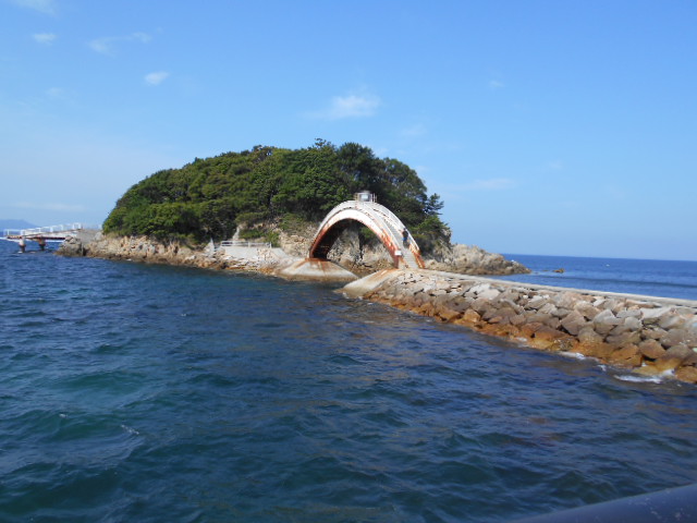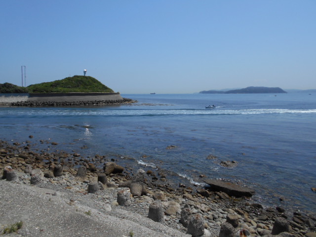| 生石鼻灯台近くの海岸から成ヶ島。遠くに見えるのは和歌山県の友ヶ島。 |