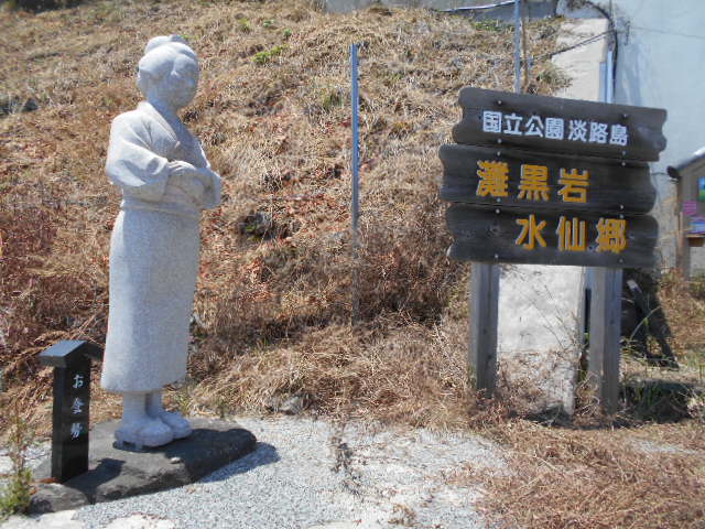 | 灘黒岩水仙郷入り口に立つ人形:お登勢 船山馨の小説『お登勢』のヒロインお登勢は灘黒岩の出身という設定である。 |