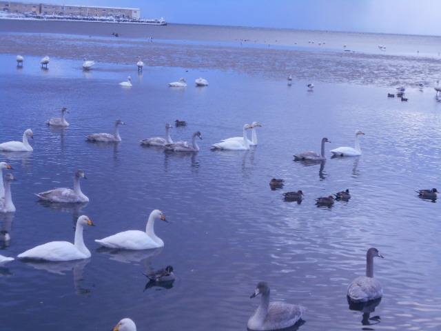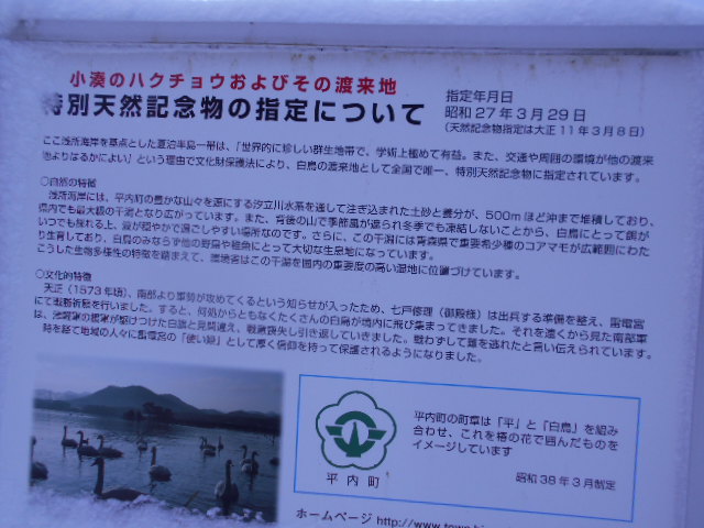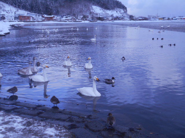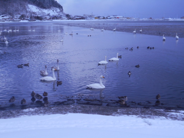 | 毎年10月中旬頃にシベリア方面から渡来し、3月下旬頃までたくさんの白鳥を見ることができ、『小湊のハクチョウおよびその渡来地』として特別天然記念物にも指定されているそうです\(^o^)/♪ 残念ながら現在は鳥インフルエンザの関係で禁止されていますが、以前は餌付けが出来たほど近い距離で白鳥を見ることが出来ます♪ |