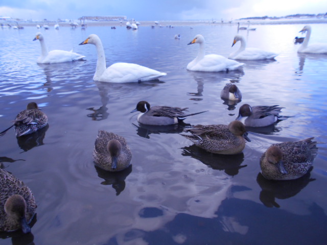 | 群がるハクチョウとカモ まったく人を怖がらない。今はコロナの影響で餌付けはされてないと聞くが、手の届くところまで近づいてきた。 |
