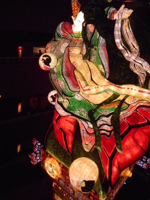 | 五所川原のねぶたは、明治時代にその高さの隆盛を極めていましたが、電線の普及と共に、背の低いねぶたとなりました。当時の写真と台座の図面が出てきたのをきっかけに、1996年市民有志が高さ22mの巨大ねぶたを復元しました。そして「立佞武多(たちねぶた)」と命名し、1998年より祭り名を「五所川原立佞武多」として約90年ぶりにふっかつさせました。 カタログから転載 |