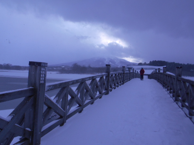 | 鶴の舞橋は平成6年7月8日、岩木山の雄大な山影を湖面に美しく映す津軽富士見湖に、日本一長い三連太鼓橋「鶴の舞橋」として架けられました。全長300メートルもの三連太鼓橋はぬくもりを感じさせるような優しいアーチをしており、鶴と国際交流の里・鶴田町のシンボルとして、多くの人々に愛されています。 岩木山を背景にした舞橋の姿が鶴が空に舞う姿に見えるとも言われ、また、橋を渡ると長生きができるとも言われています。夜明けとともに浮かび上がる湖面の橋の姿や、夕陽に色づく湖と鶴の舞橋は絶景で、季節の移り変わりと共に多くの観光客たちの目を楽しませています。 |