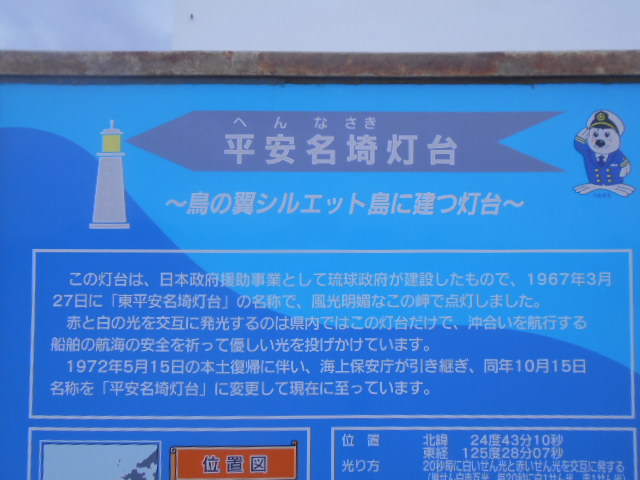 | 平安名崎灯台 この灯台は、日本政府援助事業として琉球政府が建設したもので、1967年3月27日に「東平安名崎灯台」の名称で点灯しました。 赤と白の光を交互に発光するのは県内ではこの灯台だけで、沖合を航行する船舶の安全を祈って優しい光を投げかけています。 1972年5月15日の本土復帰に伴い、海上保安庁が引き継ぎ、同年10月15日名称を「平安名崎灯台」に変更して現在に至っています。 |