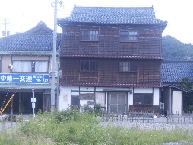 | 山中温泉街に立つ木造三階立て。 |
