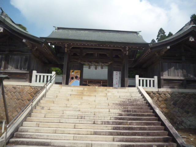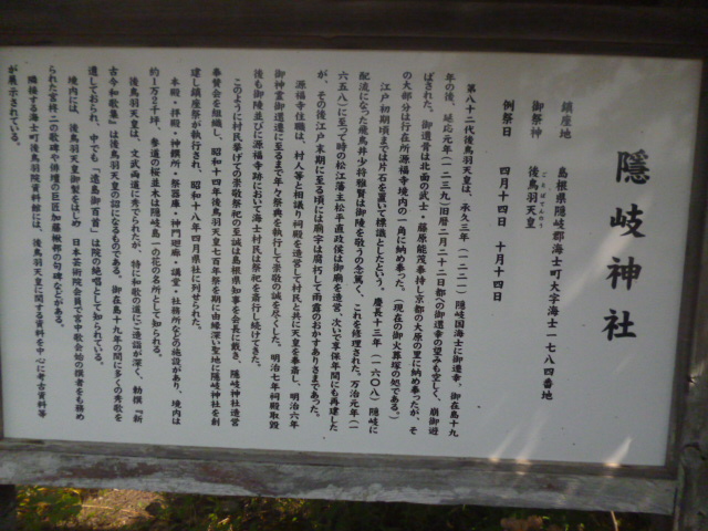 | 隠岐神社 神社は隠岐造りといわれる様式で、銅板葺きの本殿、祝詞舎、拝殿、神饌所、祭器庫、宝物館、神門回廊、社務所などからなり、5万6,000平方メートルの境内には隠岐一とたたえられる桜並木が続いています。4月14日と10月14日が例祭日で、後鳥羽天皇の御製「我こそは新島守よ隠岐の海の荒き波風心して吹け」に楽と振りを付けた、隠岐神社にだけ伝わる承久楽(じょうきゅうがく)が奉納されます。なお、神社の前には海士町後鳥羽院資料館があり、隠岐神社の宝物を中心とする後鳥羽天皇にちなむ品々が陳列されています。 |