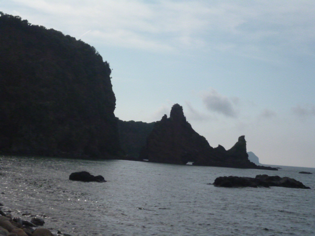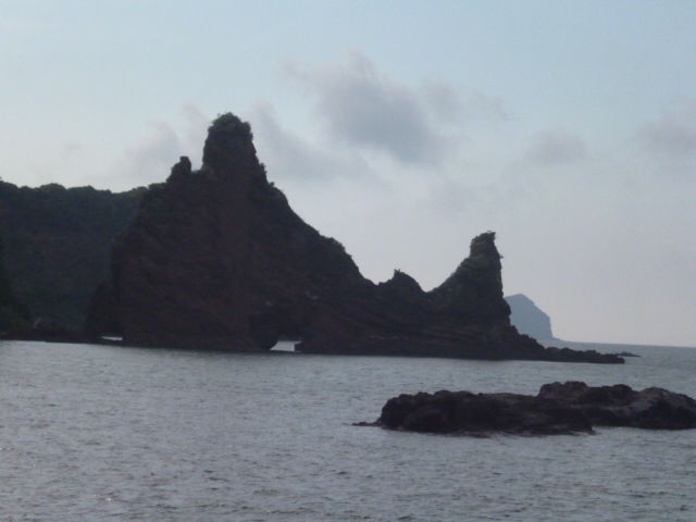 | 明屋海岸 伝説では、西ノ島の比奈麻治比賣命(ひなまじひめみこと)が宇受賀命(うづかみこと)の子「柳井姫(奈伎良比賣の別称)」を産んだ場所とされています。お産の穢れをはらい、七五三の注連縄をあげて「産屋が明けた」と意味でおこなったことから、明屋という名前が付きました。また、比奈麻治比賣命がお産の時に使用した屏風とたらいを捨てたところ、それぞれ「タライ岩」「屏風岩」になったとされています。 |
