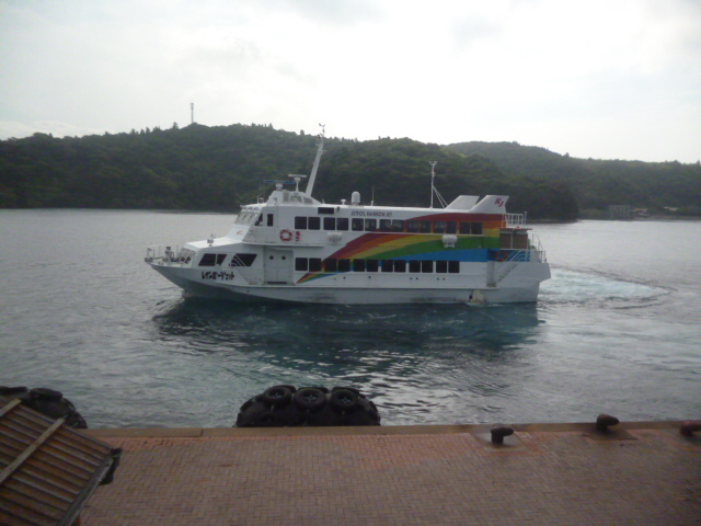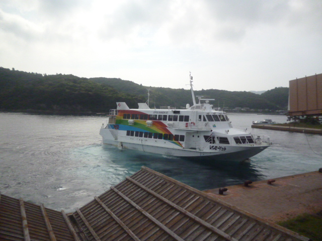 | 菱浦港からの高速船レインボージェットが接岸中。明日はこの船に乗って菱浦からこの島経由で島後・西郷港に向かいます。 |