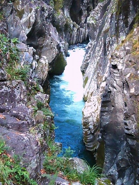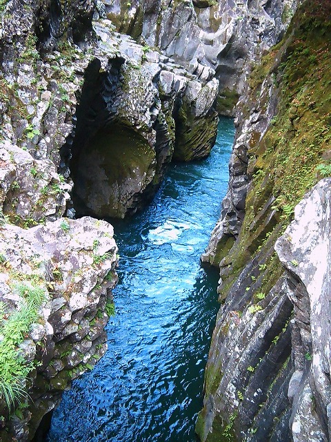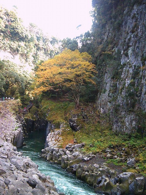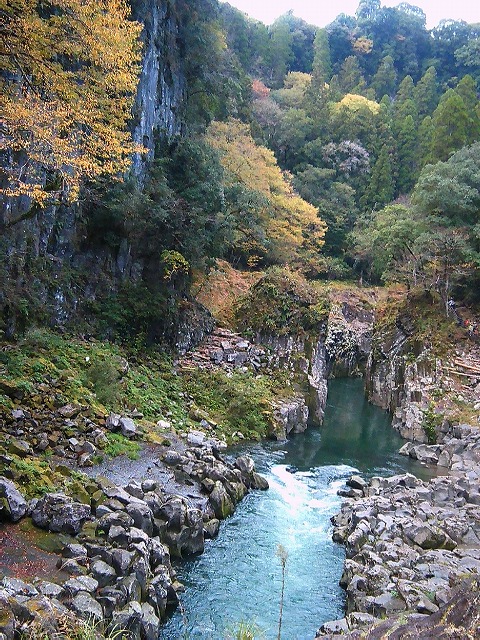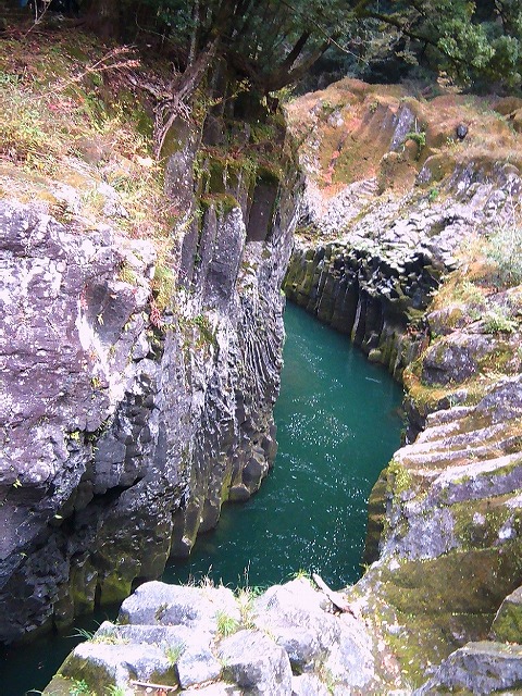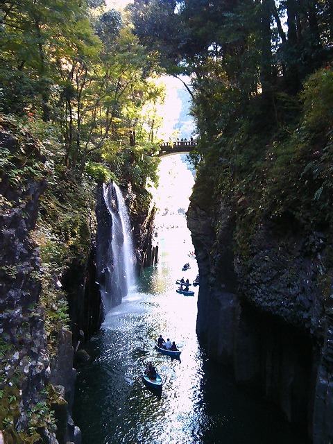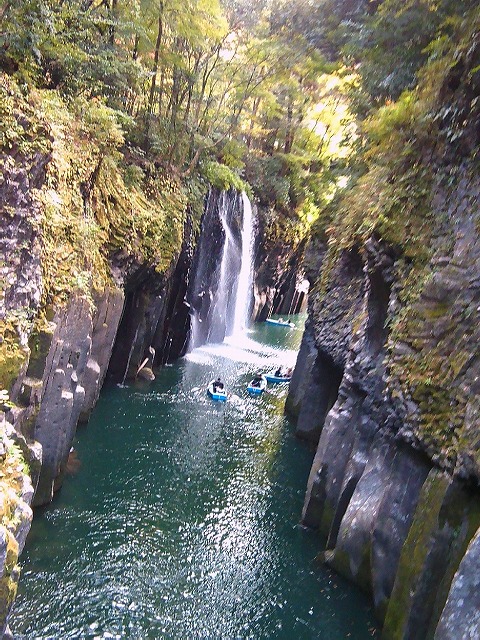 | 高千穂峡 高さ約80~100mもの断崖が約7kmに渡って続く高千穂峡。その雄大な渓谷美は、阿蘇山の火山活動で噴出した火砕流を五ヶ瀬川が侵食して作られました。まさに自然が生み出した日本を代表する景勝地のひとつです。 一番の見どころは、日本の滝百選に指定される名瀑「真名井の滝」周辺。独特の柱状節理が形作る渓谷のエメラルドグリーンの水面をボートで巡れば、幻想的な空気に包まれ、まるで異世界へ誘い込まれたような心地になります。ボートから見上げる滝はダイナミックで迫力満点!高さ約17mの岩肌を清流が勢いよく落ちる様を間近で体感できます。 |