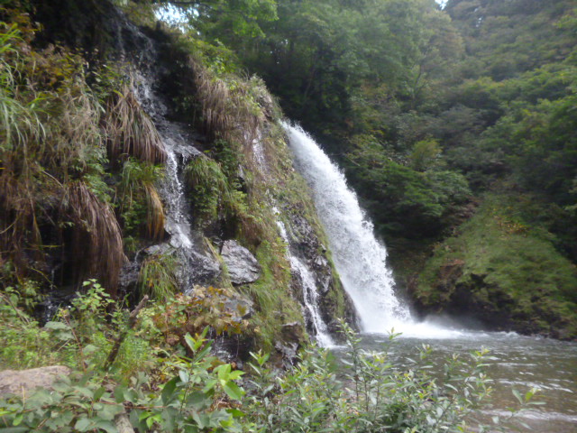 | 白銀の滝 落差は約22m。飛沫をあげながら勢いよく流れる滝と、糸のように細く繊細な流れの滝の大小2本に分かれており、時期によっては3本に分岐しているように見えることもあるのだとか。 |