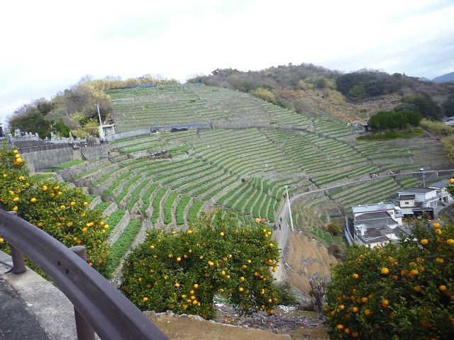 | 遊子水荷浦段畑 愛媛県宇和島市遊子水荷浦2323 「耕して天に至る」と形容される段々畑は、急な山の斜面に石垣を積み上げて造られた階段状の畑地です。その雄大な景色は、国の重要文化的景観や日本農村百景に選定されているほどで、下から見上げると、まるで天に上る階段のようにも見えます。 |
