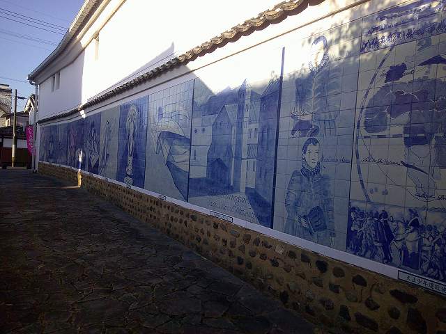 | 久家の大蔵 久家(くげ)の大蔵は江戸時代後期頃建築され、酒の貯蔵庫として利用されていました。 老朽化にともない取り壊される予定だったものを、平成12年5月、壁面にポルトガルの著名なアズレージョ作家・ロジェリオ・リベイロ氏による伝統的装飾絵タイル・アズレージョが施され、白壁に映える青色が美しい南蛮文化交流施設として生まれ変わりました。 |