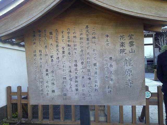 | 龍原寺 1600年(慶長5年)に、円誉を開山に豊後臼杵藩初代藩主稲葉貞通によって創建された]。暴れる龍の夢を見た円誉が後陽成天皇の六字名号の掛軸を奉じて当地に赴き、龍を昇天させて開基したという伝説がある。その寺宝として龍の珠、鱗、爪がある(非公開)。 |
