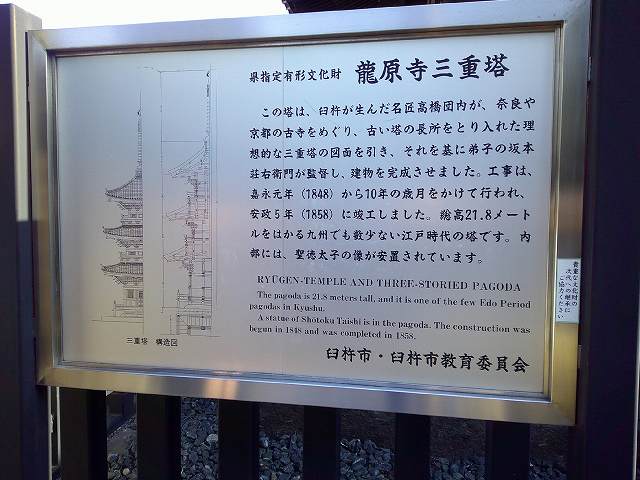 この龍原寺の三重塔は、太子塔ともよばれ聖徳太子を祀る塔です。浄土宗総本山知恩院の末寺で、慶長5年(1600年)に創建されました。当時の領主だった稲葉右京貞通公が、船で下向してきた円誉上人に高徳を感じ、現在の地である龍ヶ渕にお寺を創ったのがはじまりです。九州に2つしかない江戸期の木造三重塔で、県指定の文化財に指定されています。 軒下の柱との境には、小さな鬼の像がユニークな表情で屋根を支えています。 |