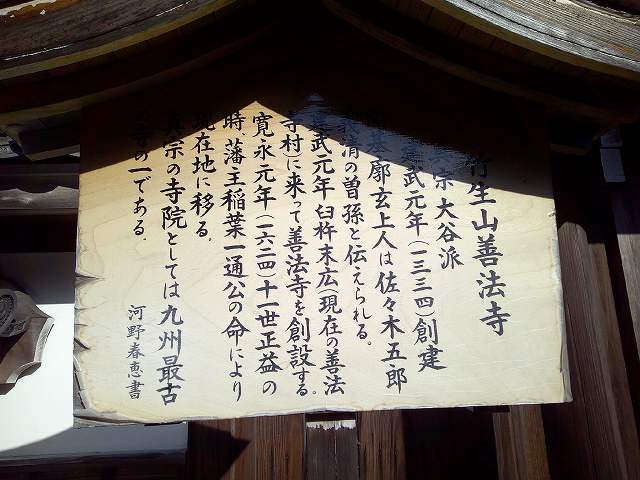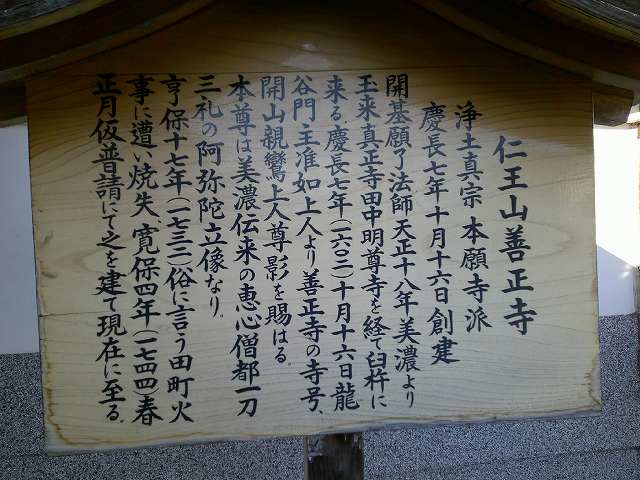 | 仁王山善正寺 浄土真宗本願寺派 慶長七年十月十六日創建 開基 願了法師 天正十八年美濃より 玉来真正寺 田中明尊寺を経て臼杵に来る 慶長七年(1662)十月十六日 龍谷門主准如上人より善正寺の寺号、 開山親鸞上人尊影を賜はる。 本尊は美濃伝来の恵心僧都一刀三礼の阿弥陀立像なり 享保十七年(1733) 俗に言う田町火夢に遭い焼失寛保四年(一四四)春月仮普請にて之を建て現在に至る。 |