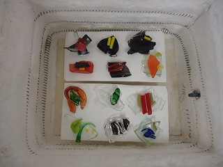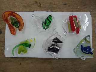 | 2015/11/11 素焼き台に離型紙を敷き、その上に色とりどりのガラス片を適当に積み重ねる。 |