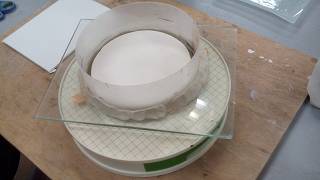 | 2015/11/18 ガラス板に皿の原型となる丸いウレタンを置き、その周りに10mm空けてアクリル板を固定します。丸いウレタンが皿の原型。 |