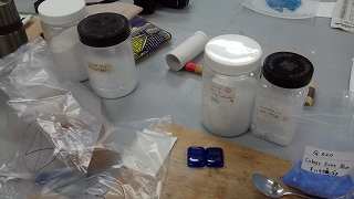 2015/11/18 コバルトブルーの色素と5種類の粒度のガラスをそれぞれ混ぜ合わせて、縞模様を作る準備中。 |