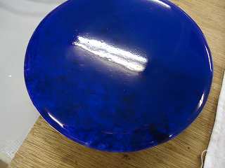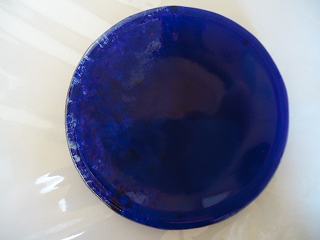 | 2015/11/25 800〜830℃で焼き上げてできあがったコバルトブルーの皿。型から離して、一部のバリはベルトサンダーで仕上げて滑らかにしました。今は円盤状ですが、更に素焼きの皿の上に載せて電気炉で焼成すると皿に沿った形にガラス皿は変形します。 来週、どんな皿に出会えるか楽しみです。 |
