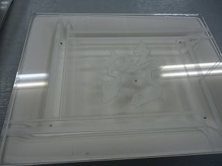 2015/11/25 透明ガラスに貼り付けた台紙の上にデザインシートを載せ、デザイン通り台紙を切り取った。切り取ったどころはガラス面が現れる。ここにサンドブラスト機で砂を当てて、ガラス面を彫り込みました。深いところで1mmくらいは掘った。写真は、掘ったガラス板を素焼き皿の上に置いたところ。 電気炉で焼き、ガラス板が素焼き皿に沿った形になれば、特製ガラス皿の出来上がり。 |
