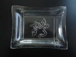 | 2015/12/02 焼成後のガラス皿です。「鶴」の文字が浮き上がって見えますか。 鶴の文字が更に浮き上がるように、色ガラスの粉を文字の所に貼り付けたら良かったかも?。 |